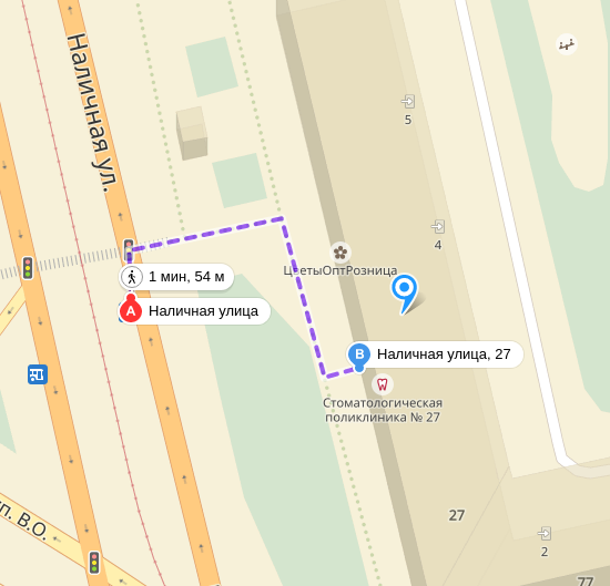 До остановок городского общественного транспорта «Малый пр. В.О.», «Наличная ул.», автобусами №1, №6, №6А, №7, №47, №100, №128, №152, троллейбусом №11, трамваем №6.